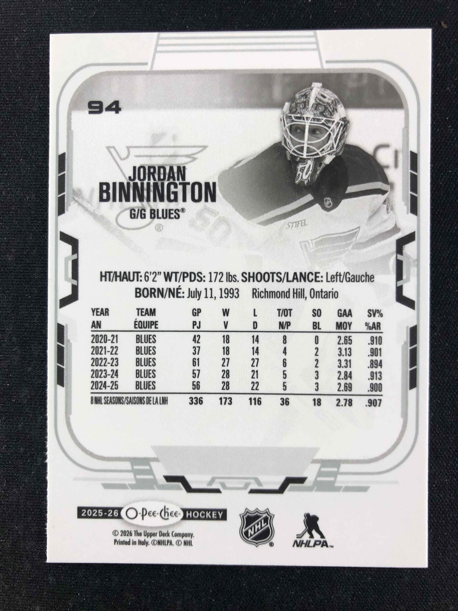 Sběratelská karta 2025/2026 Upper Deck O-Pee-Chee Base 94 Jordan Binnington