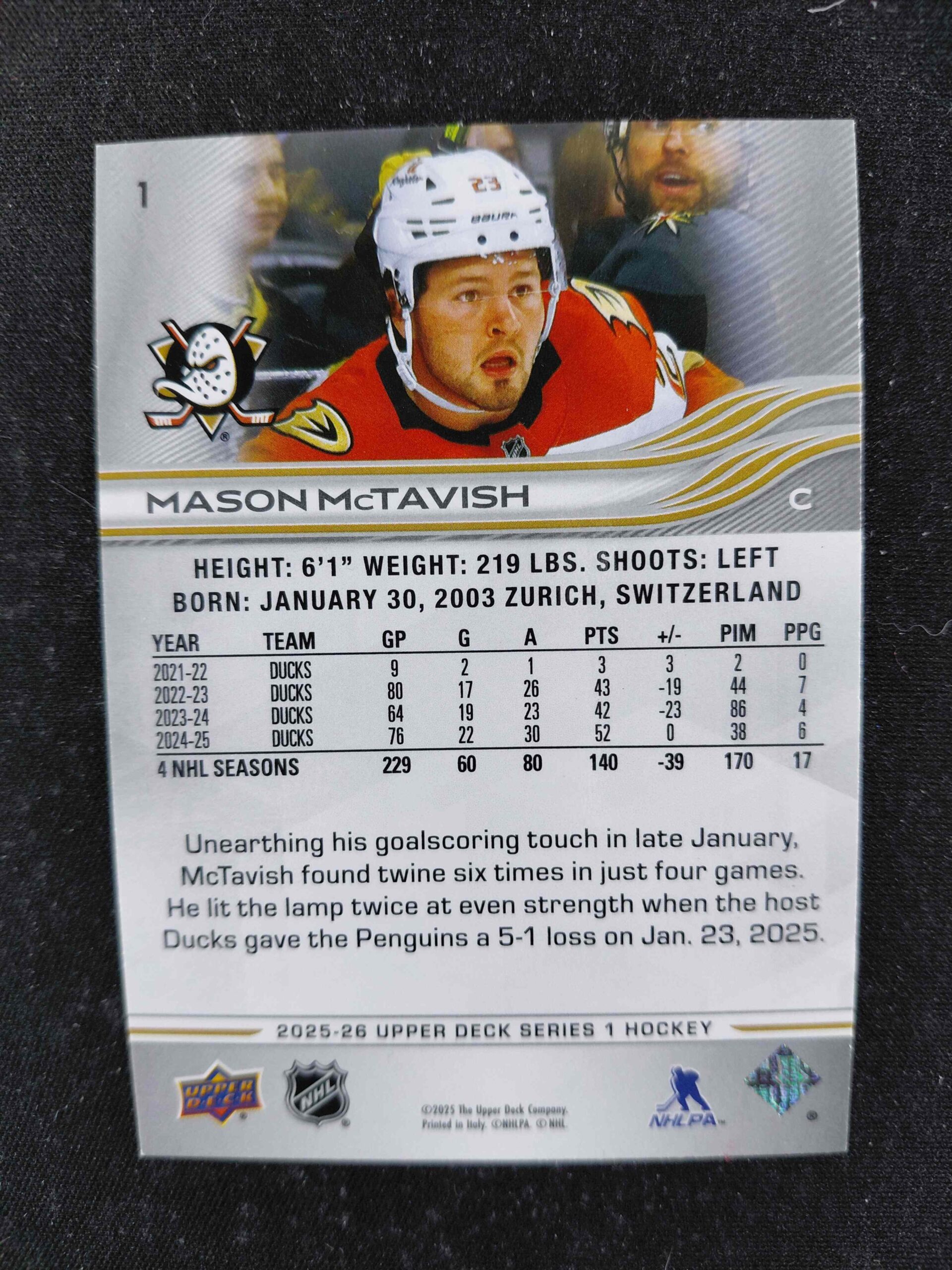 Sběratelská karta 2025/2026 Upper Deck Series 1 Base 1 Mason McTavish