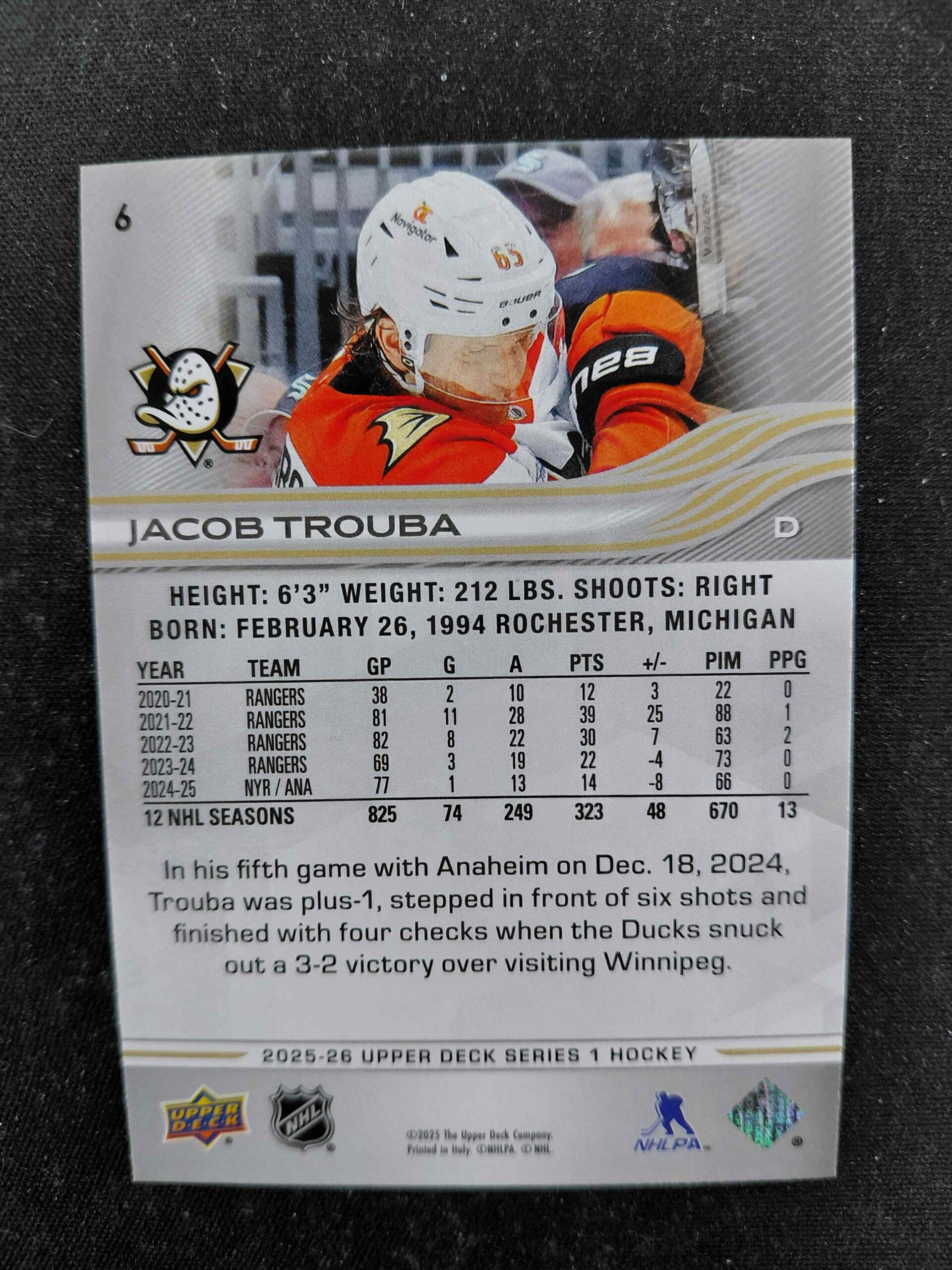 Sběratelská karta 2025/2026 Upper Deck Series 1 Base 6 Jacob Trouba