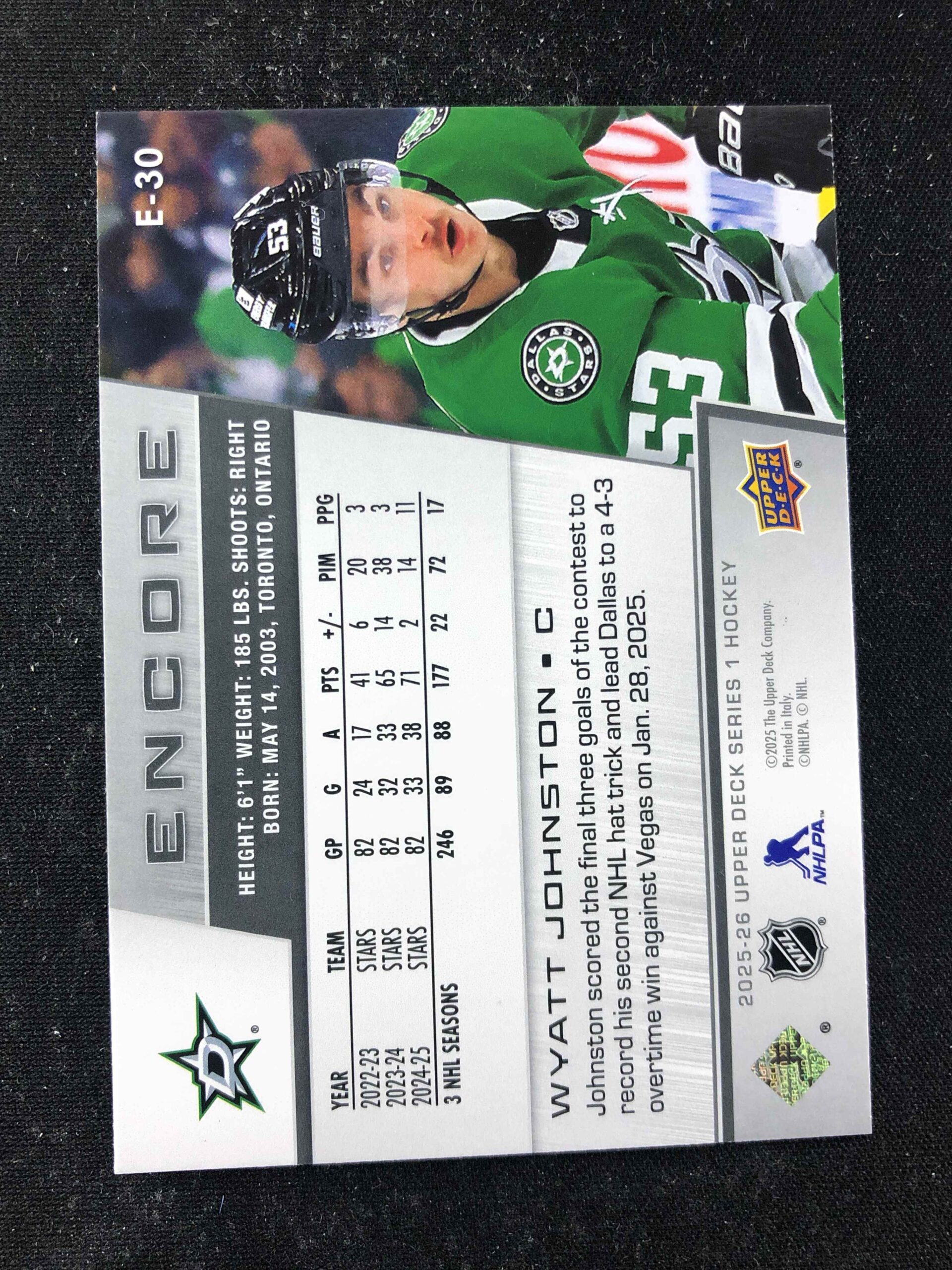 Sběratelská karta 2025/2026 Upper Deck Series 1 Encore E-30 Wyatt Johnston Inzert