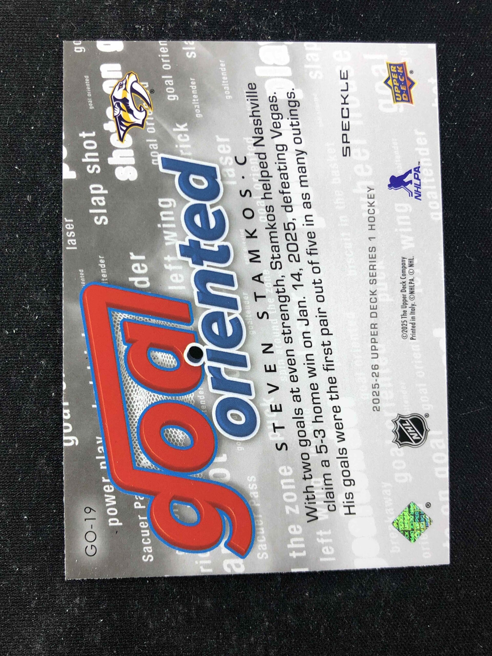 Sběratelská karta 2025/2026 Upper Deck Series 1 Goal Oriented Speckle GO-19 Steven Stamkos Inzert