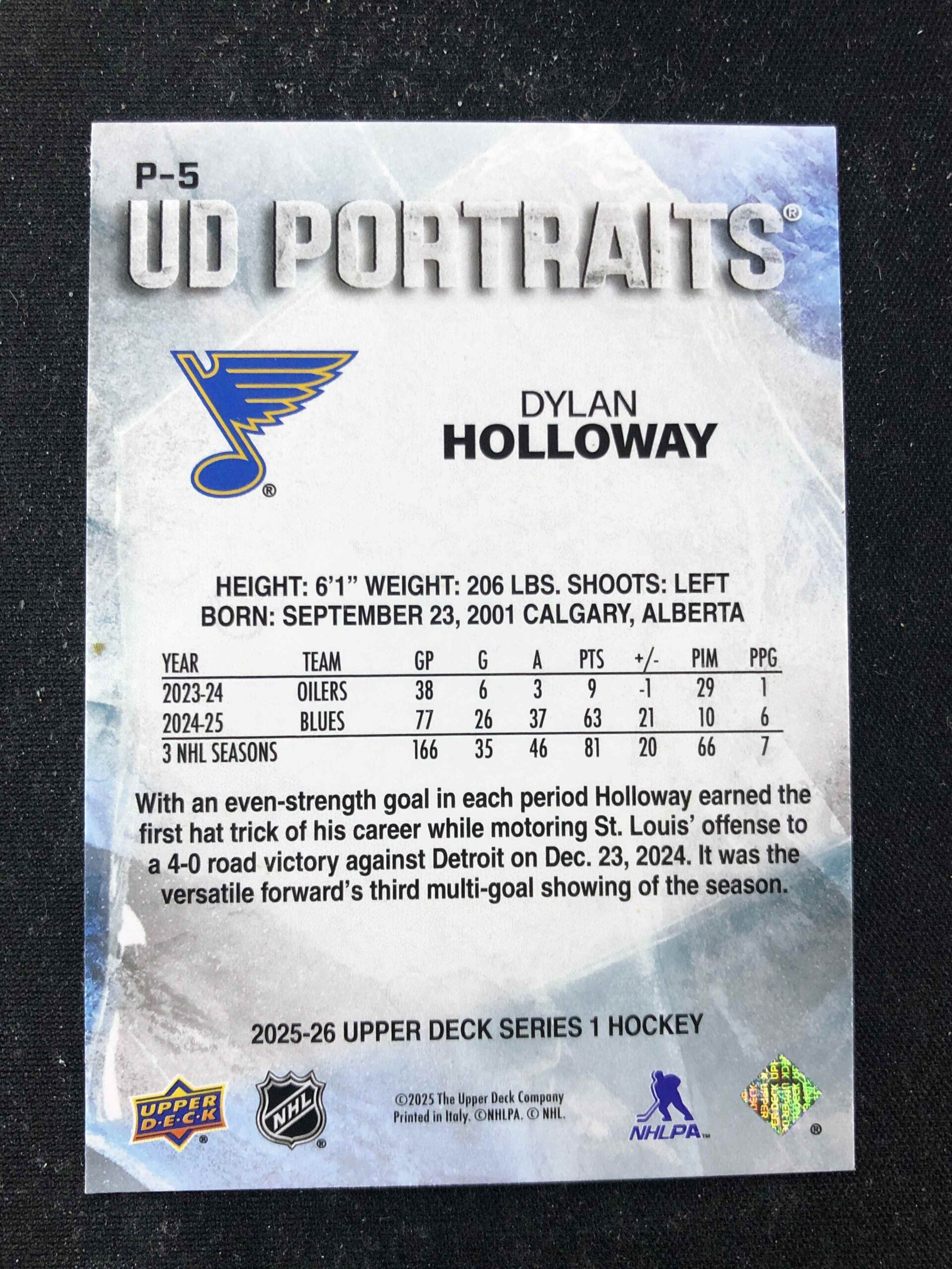 Sběratelská karta 2025/2026 Upper Deck Series 1 Portraits P-5 Dylan Holloway Inzert