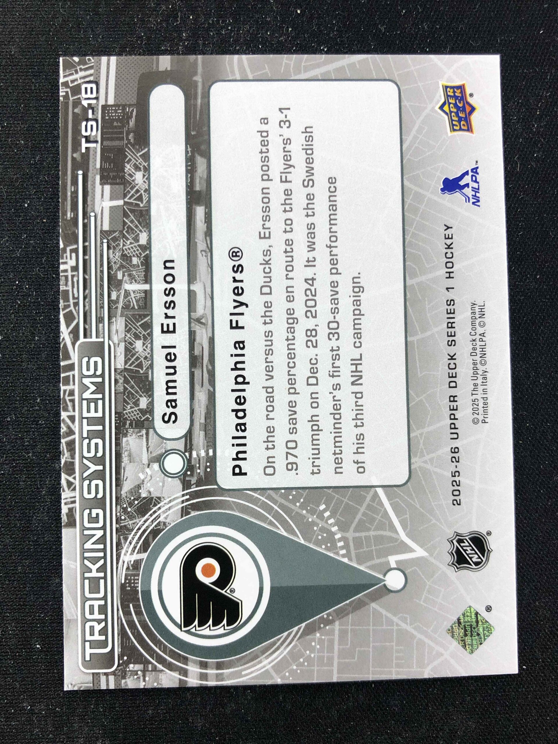 Sběratelská karta 2025/2026 Upper Deck Series 1 Tracking Systems TS-18 Samuel Ersson Inzert