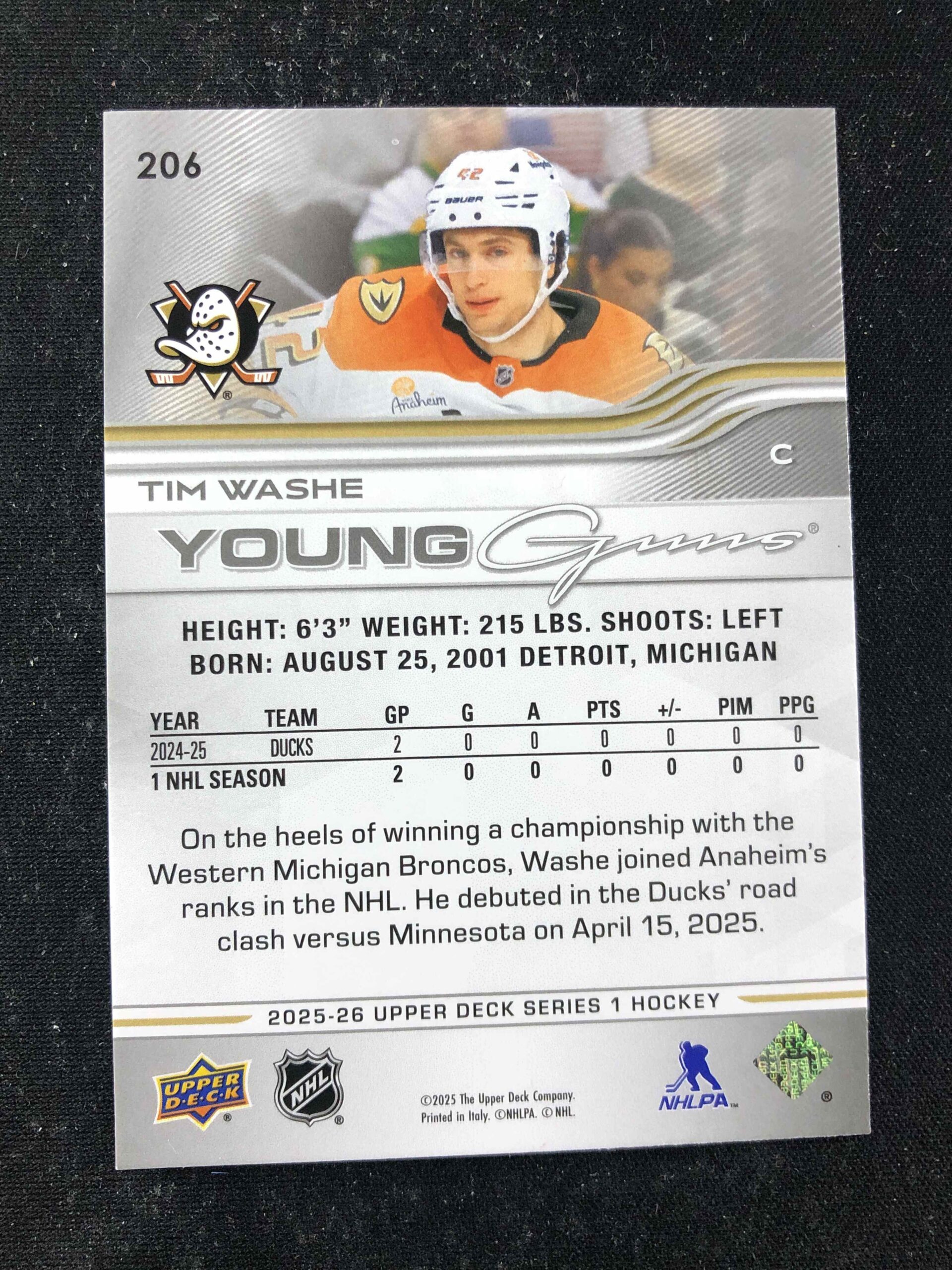 Sběratelská karta 2025/2026 Upper Deck Series 1 Young Guns 206 Tim Washe Inzert