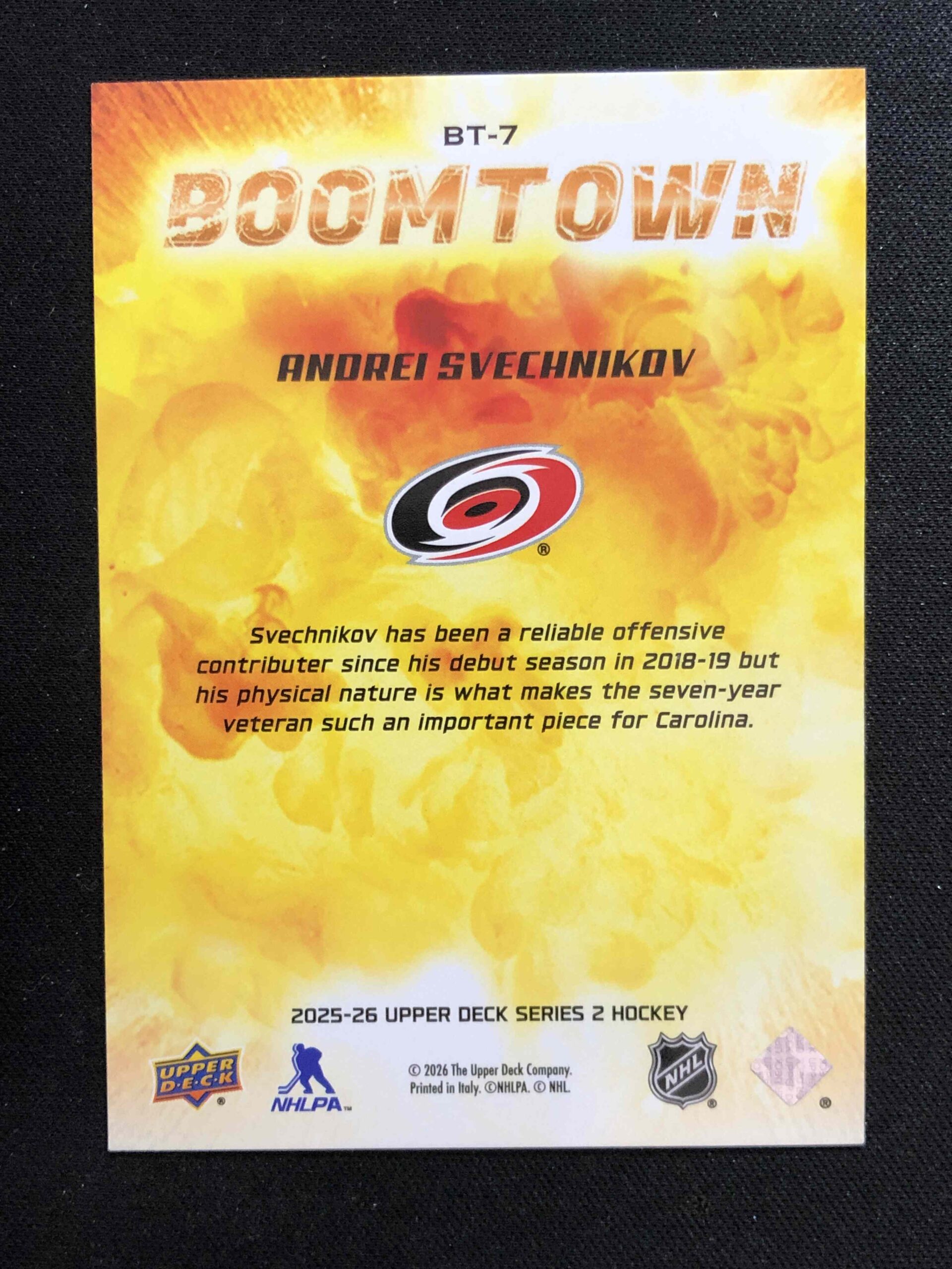 Sběratelská karta 2025/2026 Upper Deck Series 2 Boomtown BT-7 Andrei Svechnikov Inzert