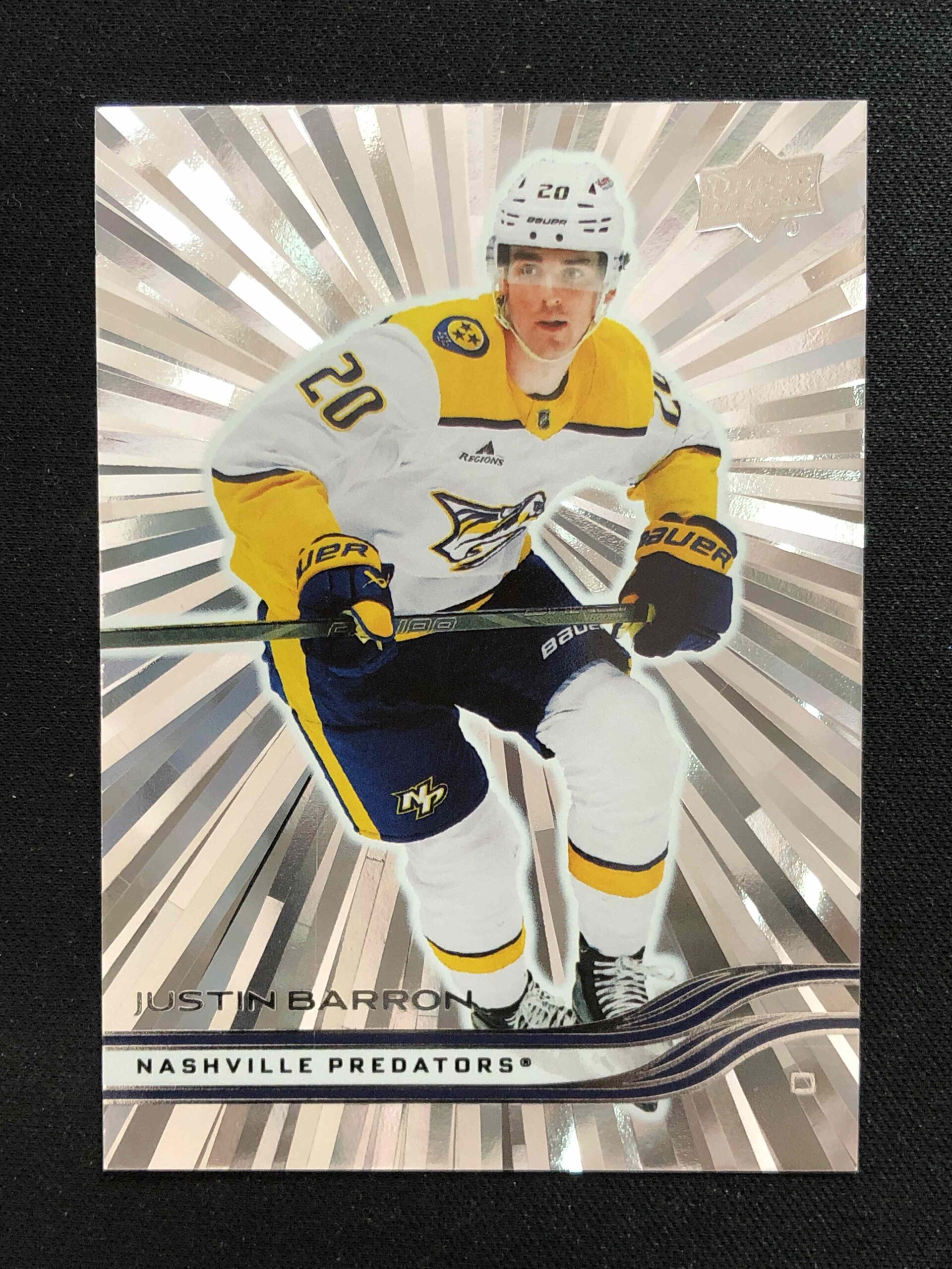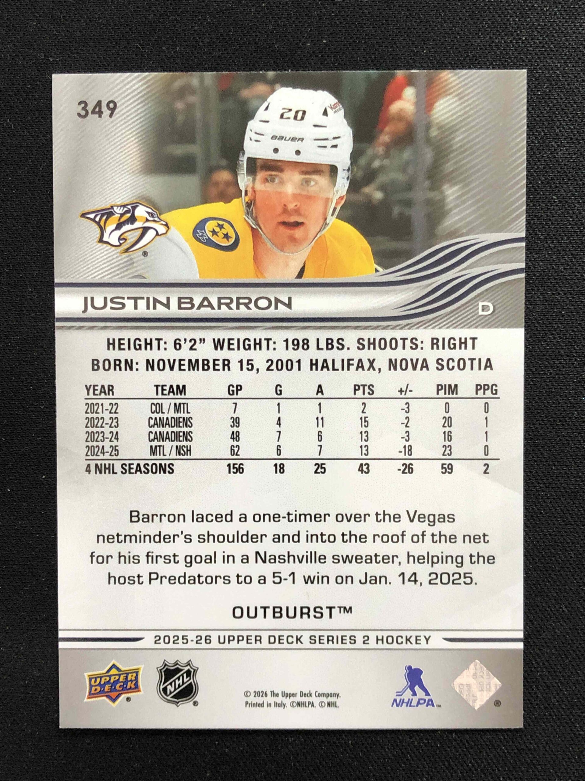 Sběratelská karta 2025/2026 Upper Deck Series 2 Outburst 349 Justin Barron Paralel