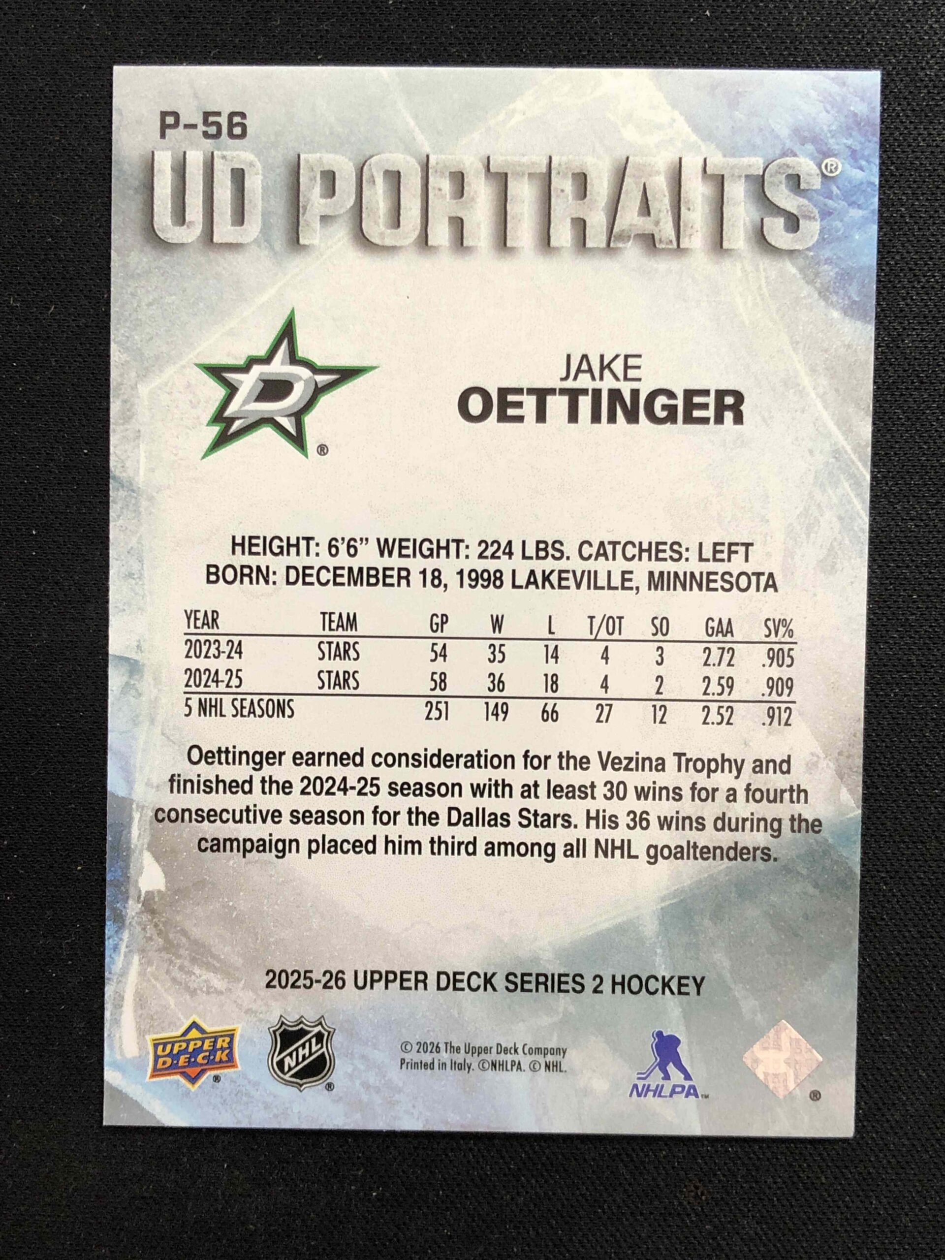Sběratelská karta 2025/2026 Upper Deck Series 2 Portraits P-56 Jake Oettinger Inzert