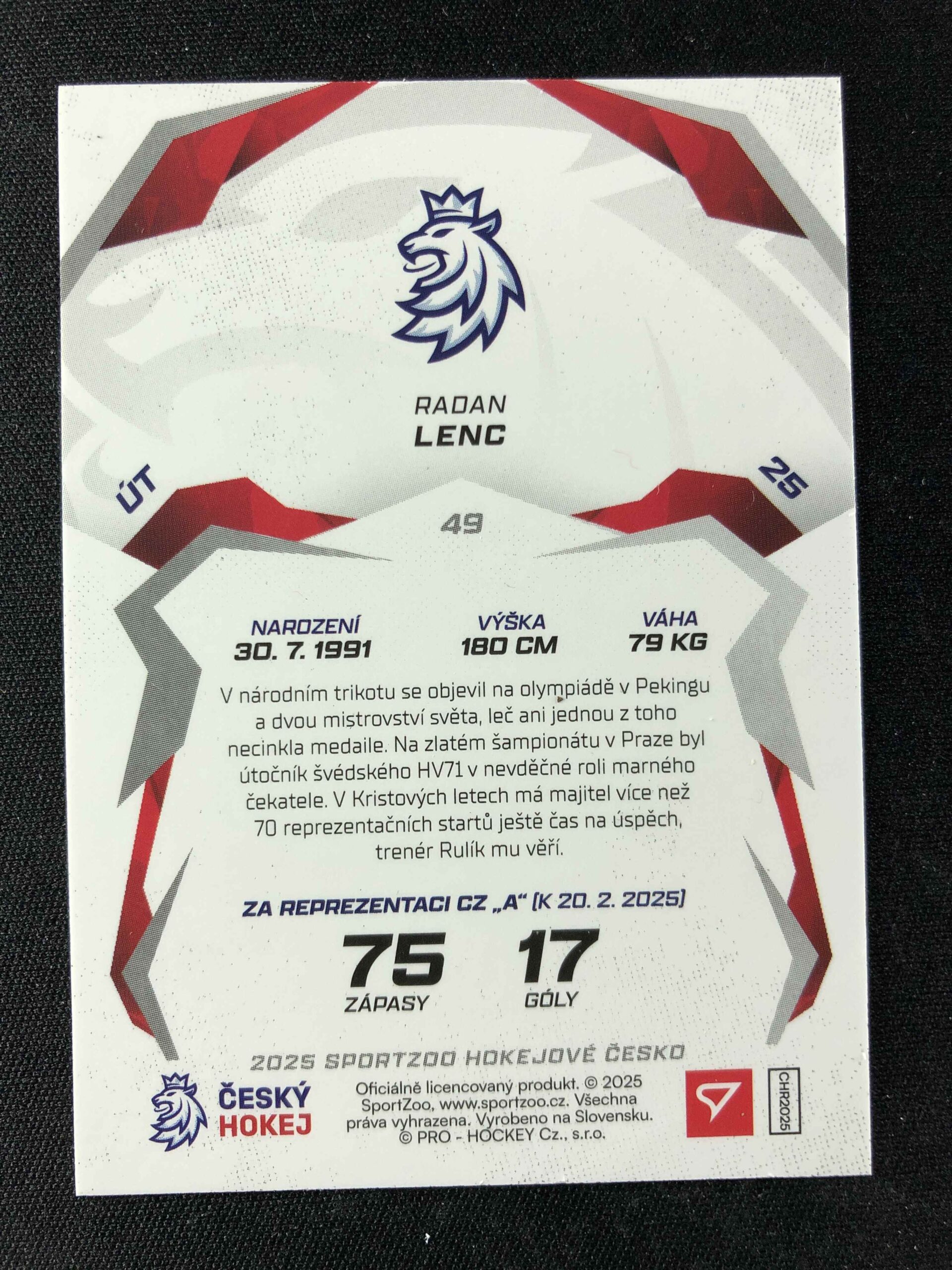 Sběratelská karta 2025 Sportzoo Hokejové Česko Blue 49 Radan Lenc Paralel