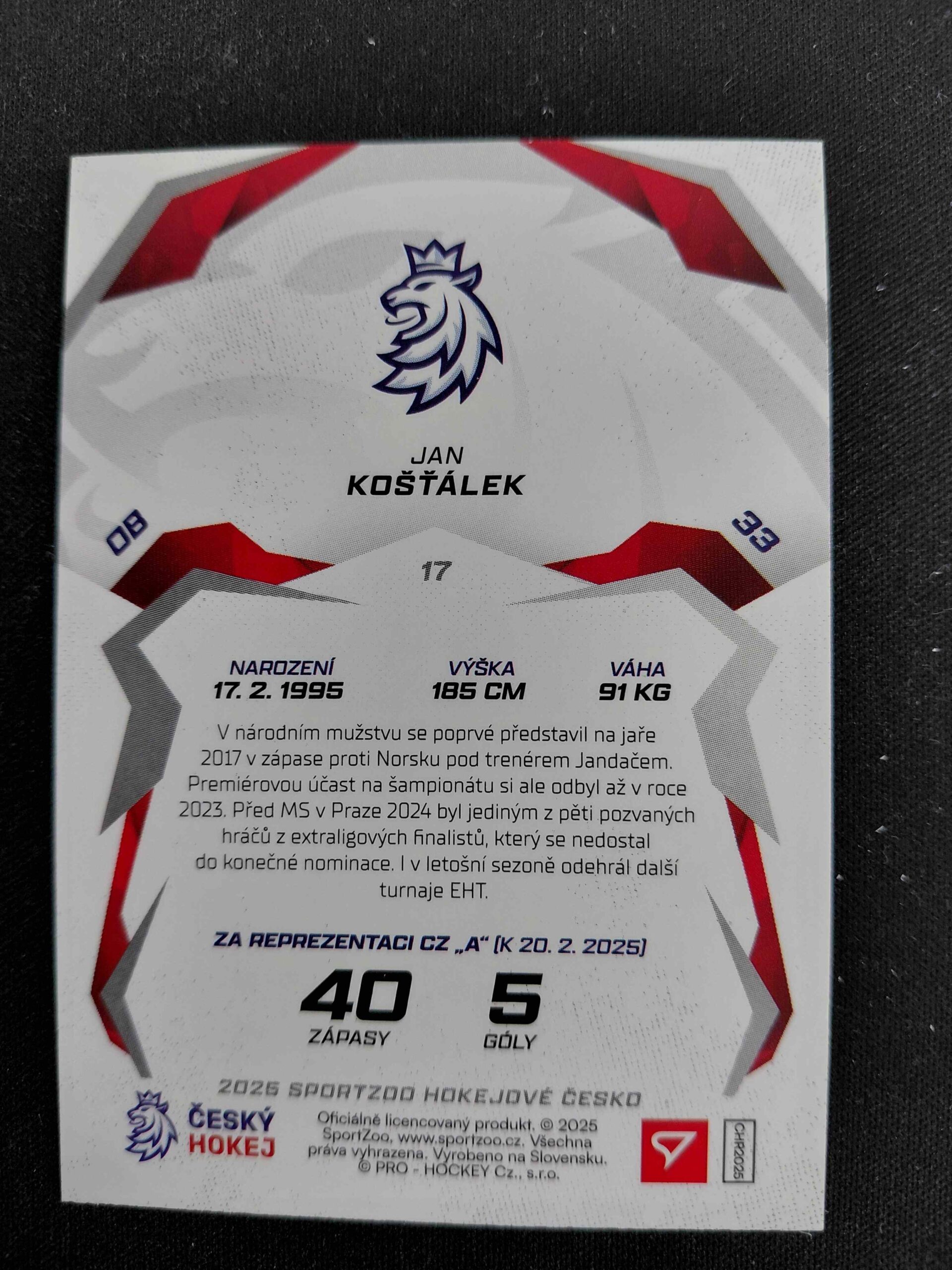 Sběratelská karta 2025 Sportzoo Hokejové Česko Red 33 Jan Košťálek Paralel