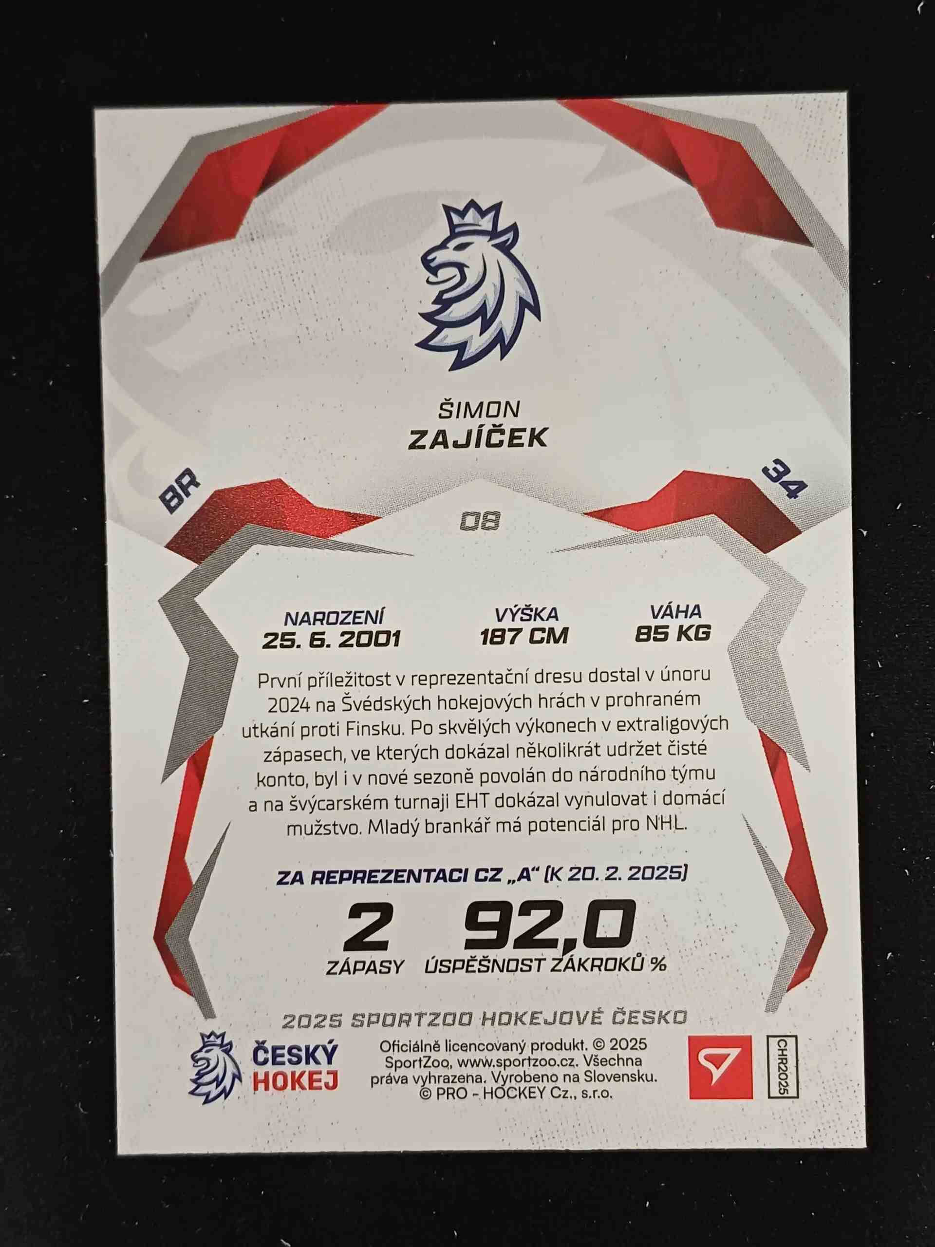 Sběratelská karta 2025 Sportzoo Hokejové Česko Red 8 Šimon Zajíček Paralel
