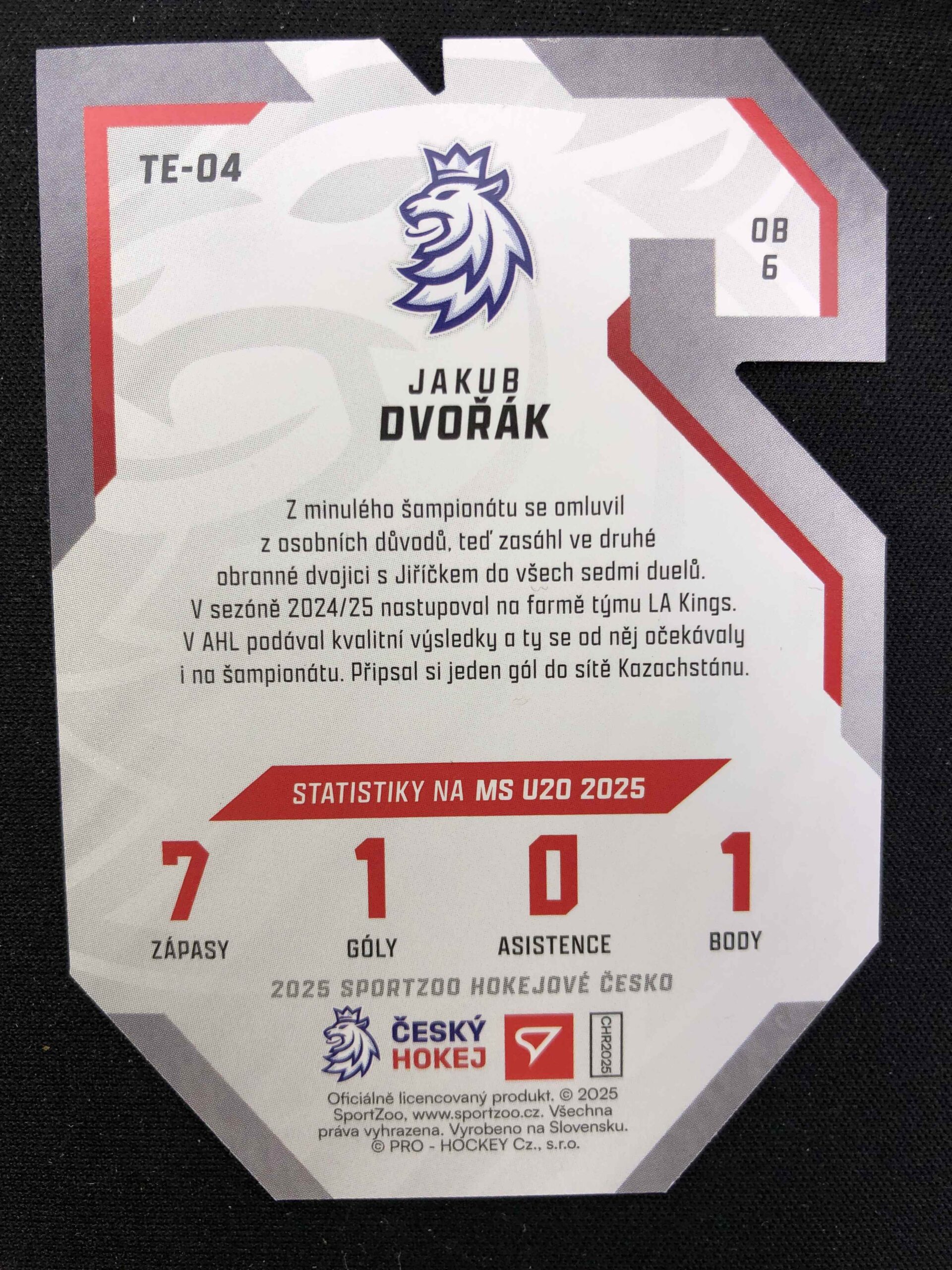 Sběratelská karta 2025 Sportzoo Hokejové Česko Team 20 TE-04 Jakub Dvořák Inzert