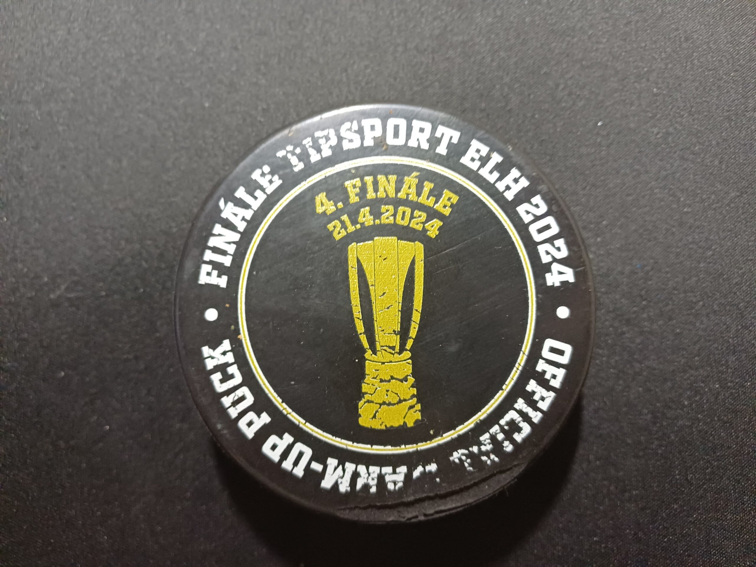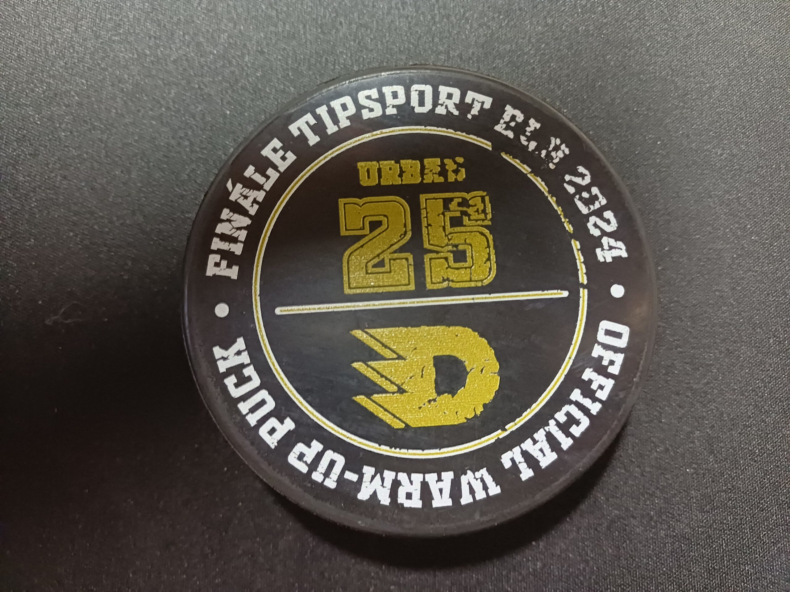 Puk, použitý na rozbruslení před 4. zápasem finálové série play-off mezi Dynamem Pardubice a Oceláři Třinec.